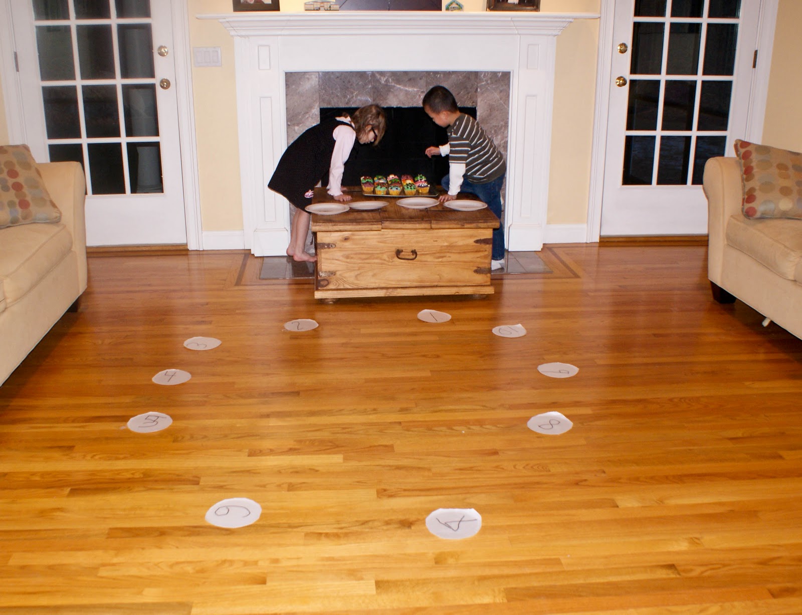Arlington and Cainan got into it as well, and our neighbor "C" was visiting so she participated as well. We set up our living room with numbers on the floor.