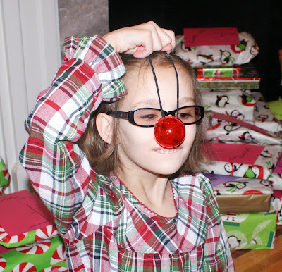 Trying on her Rudolph nose from Uncle Zac: